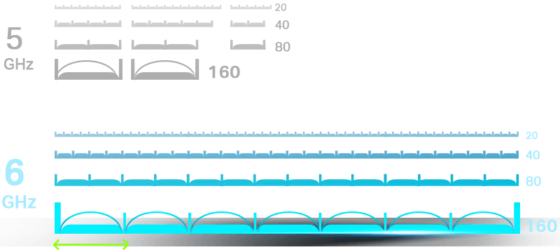 Extended to the Latest 6 GHz Band Congestion-Free, Less Interference, and Lower Latency 7x 160 MHz Channels for More Spectrum* |